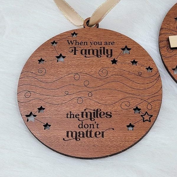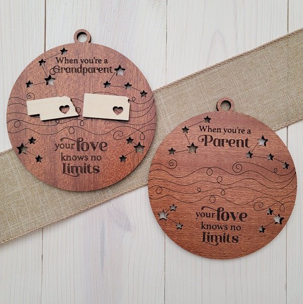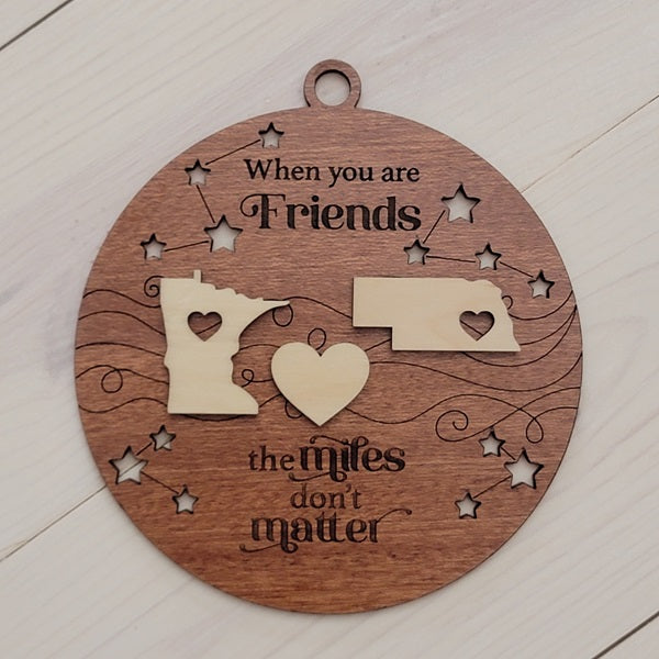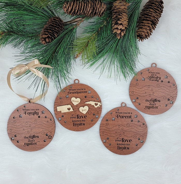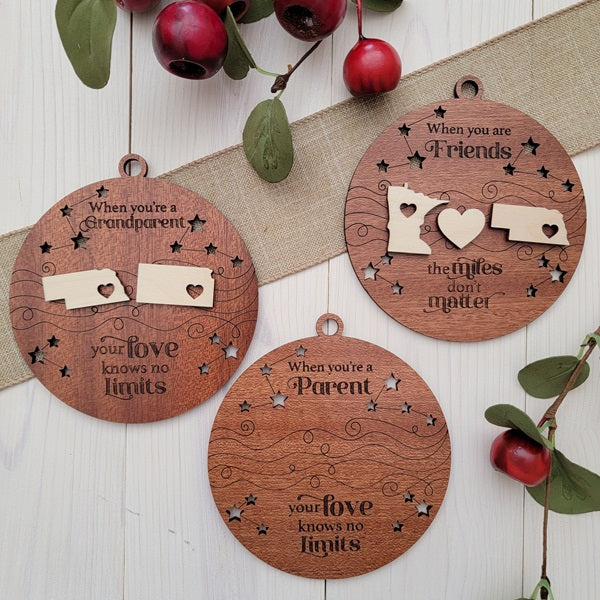 Always together, no matter how far apart! You can customize this ornament to include 2 states and up to 2 hearts. Perfect for parents, grandparents, friends and family whether near or far!