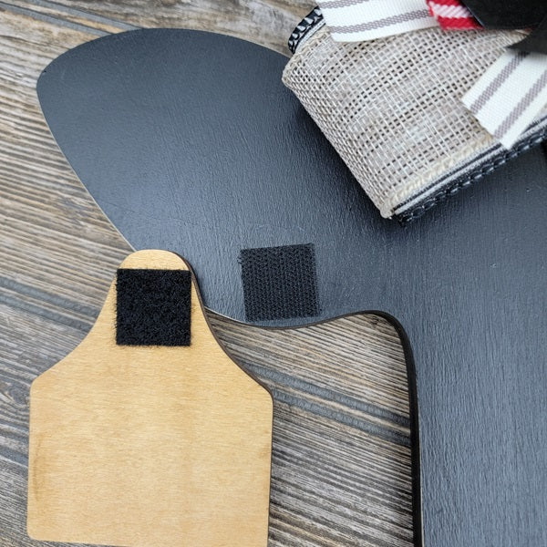 Our cow sign with interchangeable tags is a fun addition to any home. You can hang it anywhere you see fit, including your front door! With a colorful messy bow and matching flower, your cow will always be in style. Last but not least, you can choose 1 engraved, interchangeable ear tag for your cow. Additional ear tags can be purchased here.