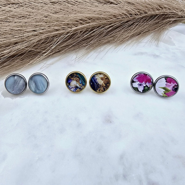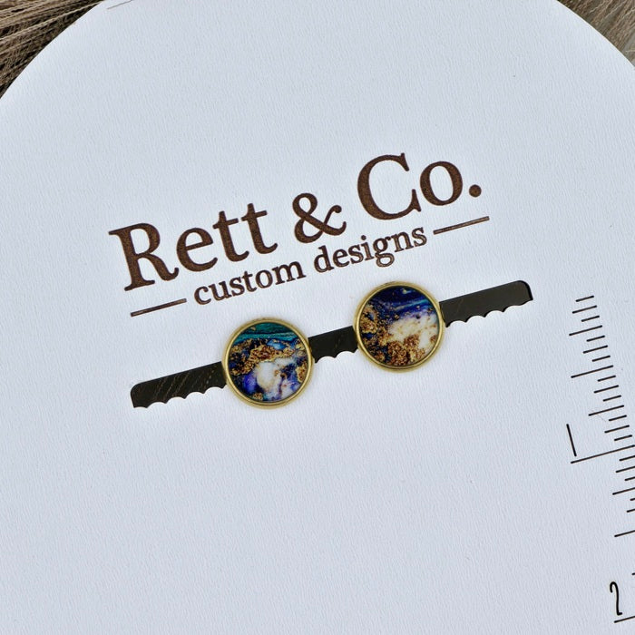 This galaxy themed print in a gold bezel creates a fun stud for everyday wear! Pick up a set today and get ready to stand out.