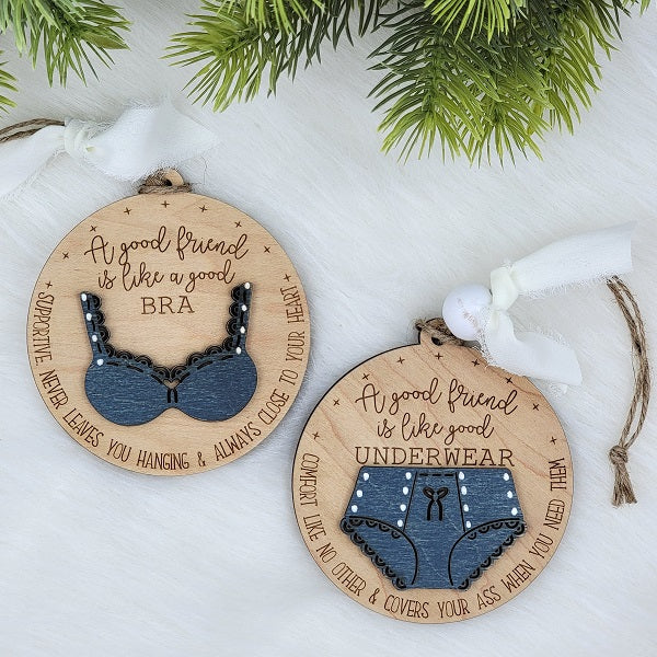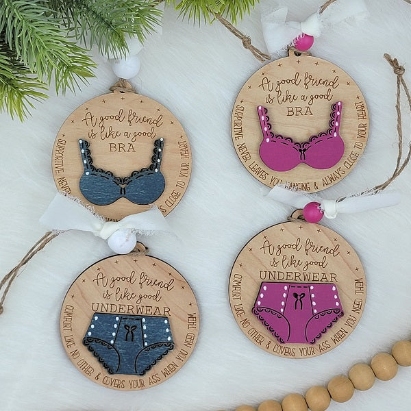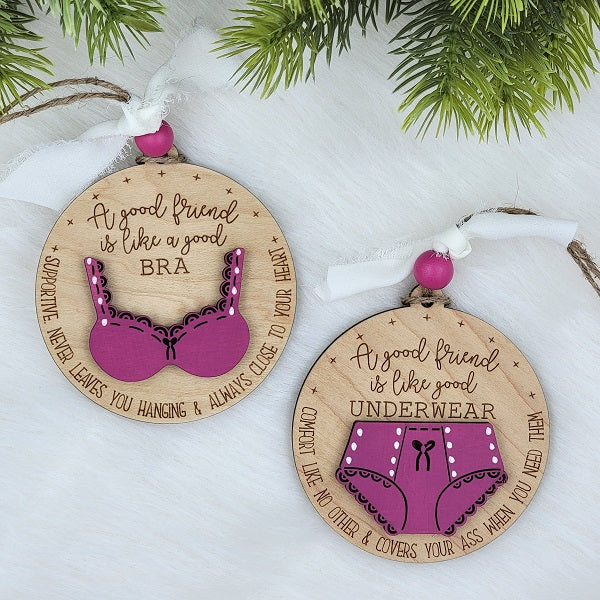 Support and comfort are two of the first things that come to mind when thinking of your best girlfriends! Our sassy ornaments are sure to make your friends smile. The ornament arrives ready to hang for easy holiday decorating.