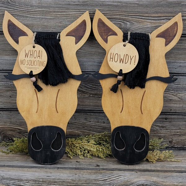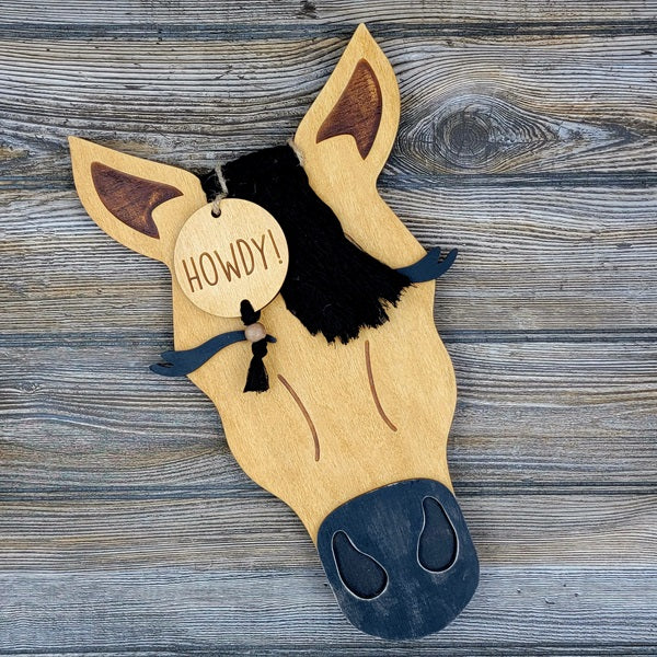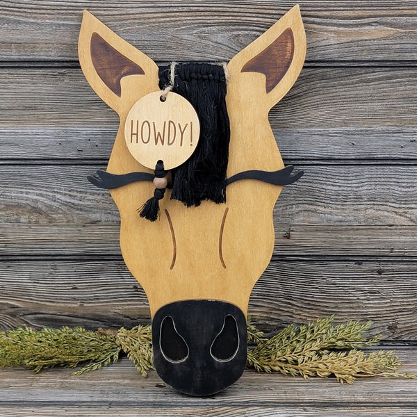 Howdy partner! Our horse decor is a fun addition to any home. You can hang your horse anywhere you see fit, including your front door! With a macrame mane and engraved rosette, your horse will always be in style.