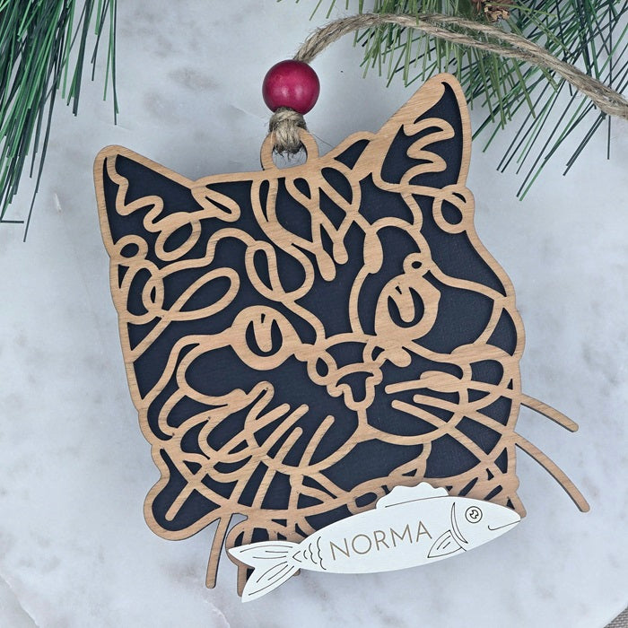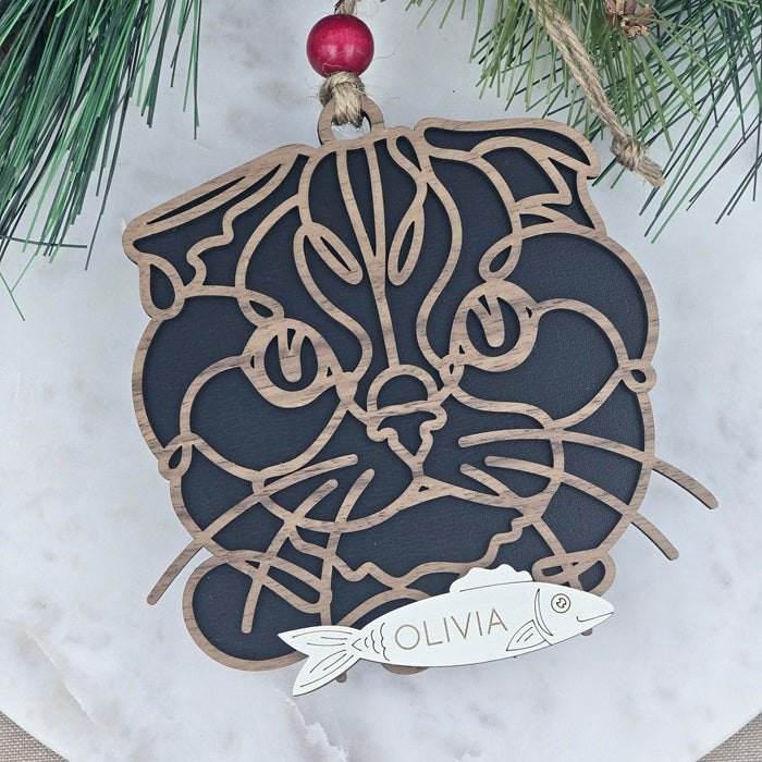 Available in your choice of walnut or cherry wood, our ornaments sit atop a sophisticated black backer to create a striking contrast and ensure they stand out on any tree or display. Whether you’re decorating for the season or celebrating your favorite cat year-round, these ornaments are a perfect way to showcase your love for cats.