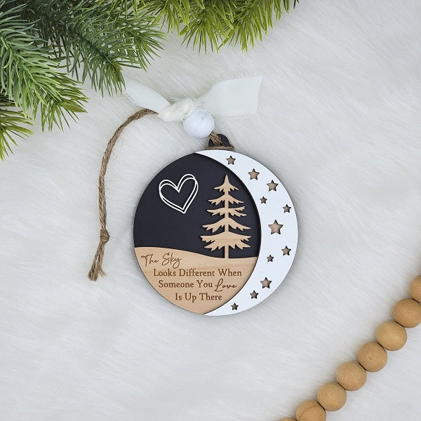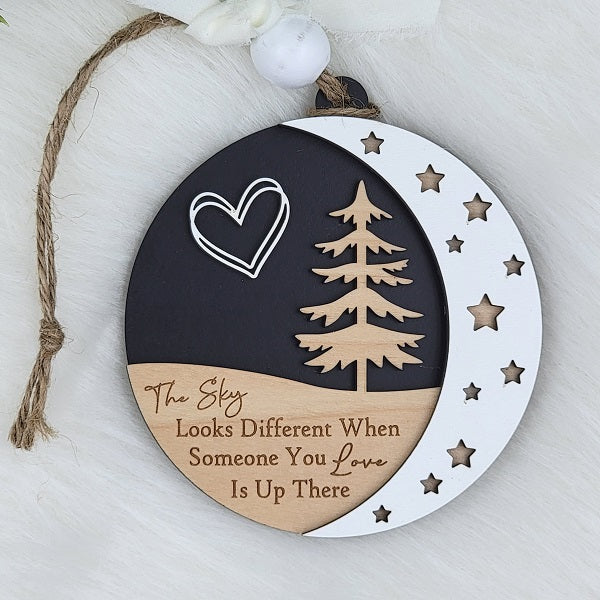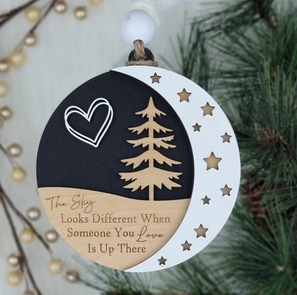 The sky looks different when someone you love is up there. Our 3 layer memorial ornament arrives ready to hang.