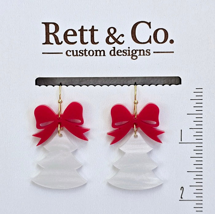 Nothing says 'holiday cheer' like a red bow and a frosted tree! These delightful earrings combine vibrant red matte acrylic with shimmering white for a look that’s both elegant and playful. Perfect for any festive occasion, they’re sure to make you stand out this season. Treat yourself or someone special—grab a pair today and celebrate in style!"