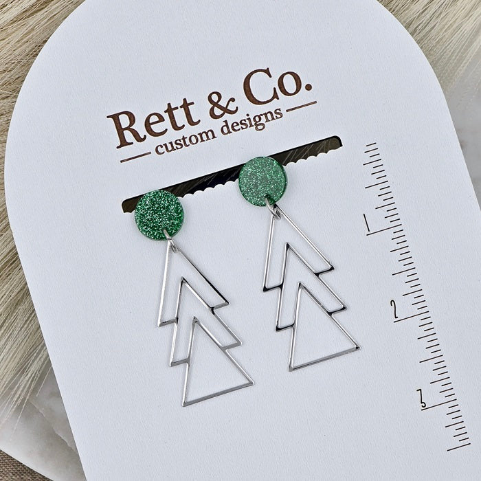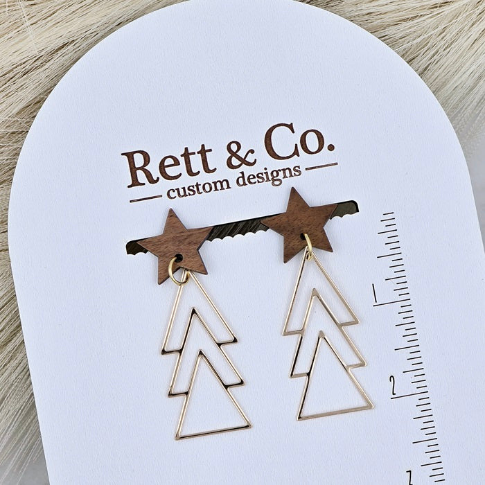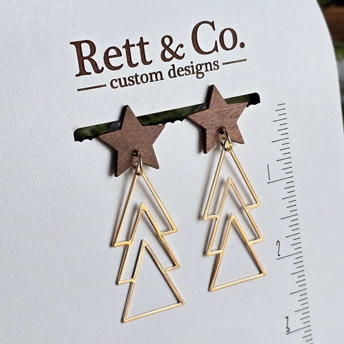 - Earring Material: Gold plated brass and walnut star OR silver plated brass and green acrylic topper.