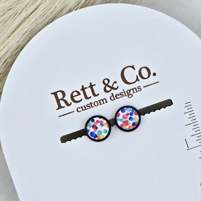 Bright watercolor bubbles in a black bezel create a fun stud for everyday wear! Pick up a set today and get ready to stand out.